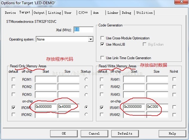 作者Liunus是用的ST公司的STM32F103VC,其Flash是256KB,SRAM 是48KB。记清楚了哟,特别是SRAM大小,这个与后面分配空间有关系。因 为我们将程序也放到SRAM中,所以需要将SRAM分为两个部分;一个部分 用于存放程序代码,另一个部分用于存放程序运行中的数据。