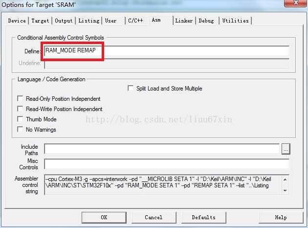 (8)如果程序中使用了中断,需要在如图红框中加入VECT_TAB_RAM。因为我目前的工程没有用中断,所以我填入的是RAM_MODE REMAP。其实这里没定义也没有关系,还可以在程序开头定义如:#define VECT_TAB_RAM