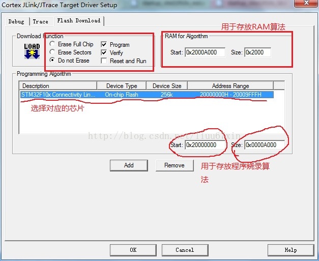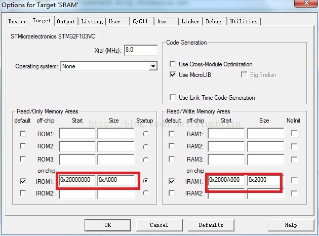(6)上图是将程序下载到FLASH中,所以Read/Only Memory Areas起始地址是0x800 0000,大小0x4 0000;Read/Write Memory Areas起始地址是0x2000 0000,大小0xC000;但是我们是在SRAM中进行调试,所以需要修改这两个区域,结果如图下图: