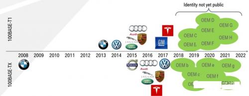车载以太网的发展速度比较惊人,自从BMW在2008年在第一个车型上搭载以太网的,10年以来很多车企都在入局。