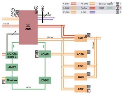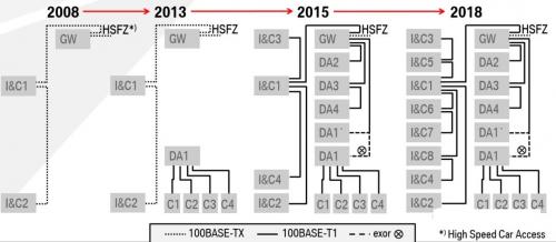 在2013年得以实现,BMW牵头创建了一对非屏蔽双绞线的以太网物理层(IEEE 100base-T1),这里也是透过一些车型平台来看这个以太网的实际部署速度快速从局部网络阶段、子网络阶段,开始往多子网络阶段走。