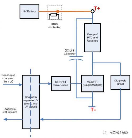 当整车或电控系统发生故障后,BMS会断开主接,将电池和电控系统进行分离,但此时电控系统内的直流母线电容上仍然有高压存在。如今母线电容通常采用薄膜电容,其漏电流很小,自身放电很慢,所以为了安全,需要外界电路帮助其快速放电。放电后电压应降到50Vdc以下,残余的能量低于0.2J,放电时间要求5~60s(国内好多主机厂要求1~2s内)。