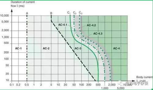人体触电的危险取决于触电电流和触电时间。下图中横坐标是触电电流(mA),纵坐标是触电时间(ms),对于高于AC-2的交流触电和DC-2的直流触电,都是有人身危险的。