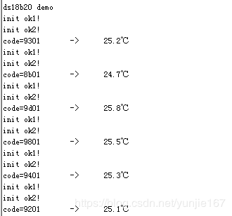 for(i=0;i { for(j=0;j<71;j++) ; } } void uart_init(void) { TXSTA=0x24; //开启发射使能位、高波特率,TRMT初始值可0可1 RCSTA=0x80; SPBRG=0x19; //4M晶振,波特率9600,则SPBRG初值为25 } //printf函数重定向 void putch(u8 c) { TXREG = c; while(TRMT==0); } short temperature; void main() { uart_init(); Delay_ms(5); printf("ds18b20 demo\n"); while(1) { if(Init_18B20()==0) { printf("init ok1!\n"); Skip(); Convert(); Delay_ms(750); if(Init_18B20()==0) { printf("init ok2!\n"); Skip(); Read_SP(); RomCode[0]=Read_18B20(); RomCode[1]=Read_18B20(); temperature=ReadTemp(RomCode); temperature=CalcTemp(temperature); printf("code=%02x%02x\t->\t%d.%d℃\n",RomCode[0],RomCode[1],temperature/10,temperature%10); } } Delay_ms(3000); } } ds18b20.h #include #include "def.h" #ifndef __ds1820_h #define __ds1820_h extern u8 RomCode[2]; #define DQ1 RC1=1 #define DQ0 RC1=0 #define DQ_in TRISC1=1 #define DQ_out TRISC1=0 #define DQ_val RC1 #define _DINT() di() #define _EINT() ei() #define _NOP() asm("nop") u8 Init_18B20(void); short CalcTemp(short a); void Skip(void); void Convert(void); void Read_SP(void); u8 Read_18B20(void); short ReadTemp(u8 *r); #endif ds18b20.c /********************************* PIC16F877A@4MHz *********************************/ #include "ds18b20.h" #include "def.h" u8 RomCode[2]; #define DelayNus _delay u8 Init_18B20(void) { u8 Error; DQ_out; _DINT(); DQ0; DelayNus(500); //延迟至少480us DQ1; DelayNus(55); //释放DQ后延时120us(60~240)后再读数 DQ_in; _NOP(); if(DQ_val) Error = 1; //初始化失败 else Error = 0; //初始化成功 DQ_out; DQ1; _EINT(); DelayNus(400); return Error; } void Write_18B20(u8 wdata) { u8 i; for(i = 0; i < 8;i++) { _DINT(); DQ0; //DelayNus(6); //延时2us _NOP(); _NOP(); _NOP(); _NOP(); _NOP(); _NOP(); _NOP(); _NOP(); if(wdata & 0X01) DQ1; else DQ0; wdata >>= 1; DelayNus(70); //延时91us DQ1; _EINT(); _NOP(); } } u8 Read_18B20(void) { u8 i; u8 temp = 0; for(i = 0;i < 8;i++) { temp >>= 1; _DINT(); DQ0; _NOP(); _NOP(); _NOP(); _NOP(); DQ1; //DelayNus(8); //延时9us DQ_in; //DelayNus(25); //延时45us if(DQ_val) temp |= 0x80; DQ_out; DQ1; DelayNus(70); //延时10us _EINT(); _NOP(); } return temp; } void Skip(void) { Write_18B20(0xcc); } void Convert(void) { Write_18B20(0x44); } void Read_SP(void) { Write_18B20(0xbe); } short ReadTemp(u8 *r) { u8 temp_low; short temp; temp_low = r[0]; //读低位 temp = r[1]; //读高位 temp = (temp<<8) | temp_low; return temp; } const u8 dottab[]={0,1,1,2,3,3,4,4,5,6,6,7,8,8,9,9}; //优化读数算法 short CalcTemp(short a) { u8 b; if(a<0) { a=~a; a++; b=a; a>>=4; a*=-10; a-=dottab[b&0x0f]; } else { b=a; a>>=4; a*=10; a+=dottab[b&0x0f]; } return a; } def.h #ifndef __DEF__H_ #define __DEF__H_ #define u8 unsigned char #define u16 unsigned int #endif