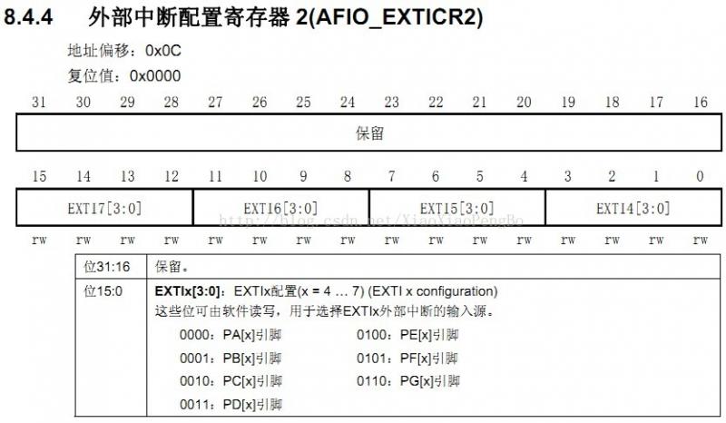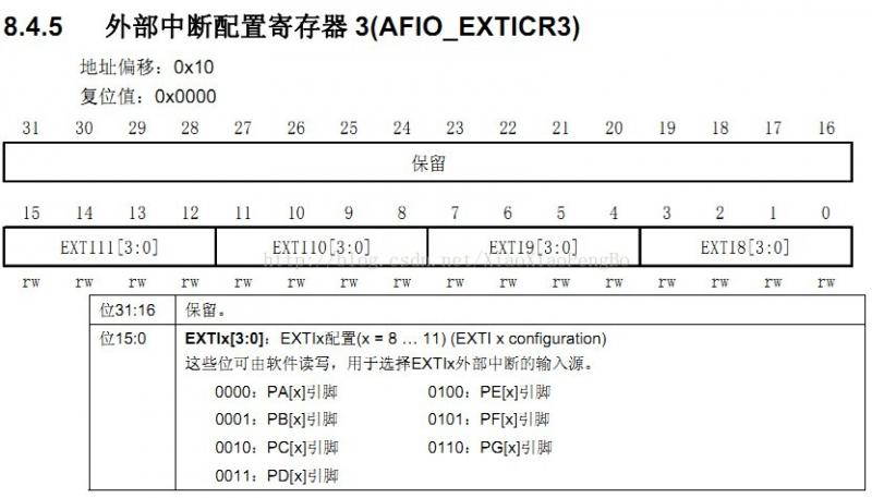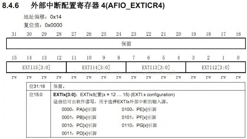 EXTICR寄存器组,总共有4 个,因为编译器的寄存器组都是从0 开始编号的,所以EXTICR[0]~ EXTICR[3],对应《STM32参考手册》里的 EXTICR1~ EXTICR 4(查了好久才搞明白这个数组的含义!!)。每个 EXTICR只用了其低16 位。