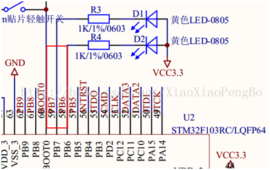 有两个LED灯D1,D2,分别对应的PIN是PB6,PB7,低电平时点亮LED灯