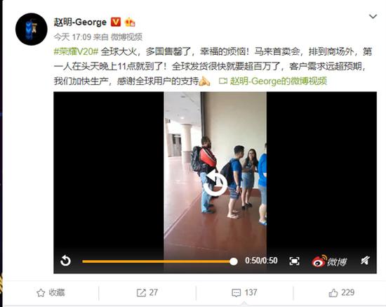 他以荣耀V20的马来首卖会为例,称排队抢购该机的消费者长队已经排到了商场外,其中队首第一人在发售前一天晚上11点就早早赶到,经历彻夜等候在如愿拿到机器。