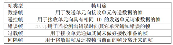 另外,数据帧和遥控帧有标准格式和扩展格式两种格式。标准格式有11个位的标识符(ID),扩展格式有29个位的ID。各种帧的用途如表所示