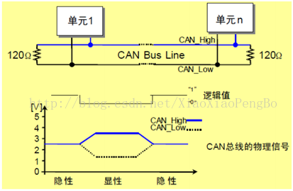 电平对应逻辑1,CAN_H和CAN_L之差为0V。在总线上显性电平具有优先权,只要有一个单元输出显性电平,总线上即为显性电平。而隐形电平则具有包容的意味,只有所有的单元都输出隐性电平,总线上才为隐性电平(显性电平比隐性电平更强)。另外,在CAN总线的起止端都有一个120Ω的终端电阻,来做阻抗匹配,以减少回波反射。