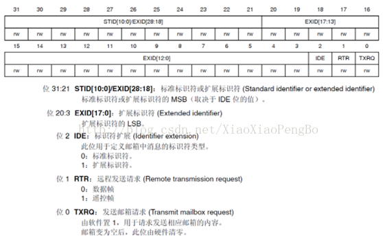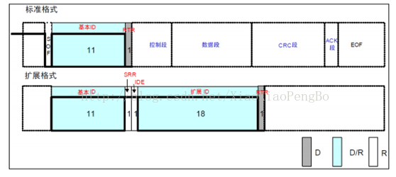 标准格式的ID有11个位。从ID28到ID18被依次发送。禁止高7位都为隐性(禁止设定:ID=1111111XXXX)。扩展格式的 ID 有29个位。基本ID从ID28到ID18,扩展ID由ID17到ID0表示。基本ID和标准格式的ID相同。禁止高7位都为隐性(禁止设定:基本ID=1111111XXXX)。其中RTR位用于标识是否是远程帧(0,数据帧;1,远程帧),IDE位为标识符选择位(0,使用标准标识符;1,使用扩展标识符),SRR位为代替远程请求位,为隐性位,它代替了标准帧中的RTR位。