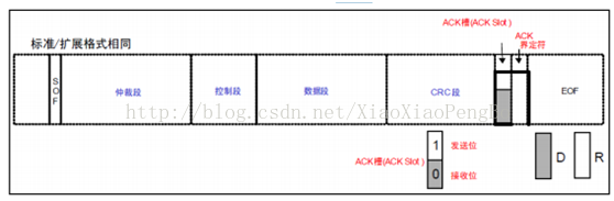 ACK段,此段用来确认是否正常接收。由ACK槽(ACK Slot)和ACK界定符2个位组成。