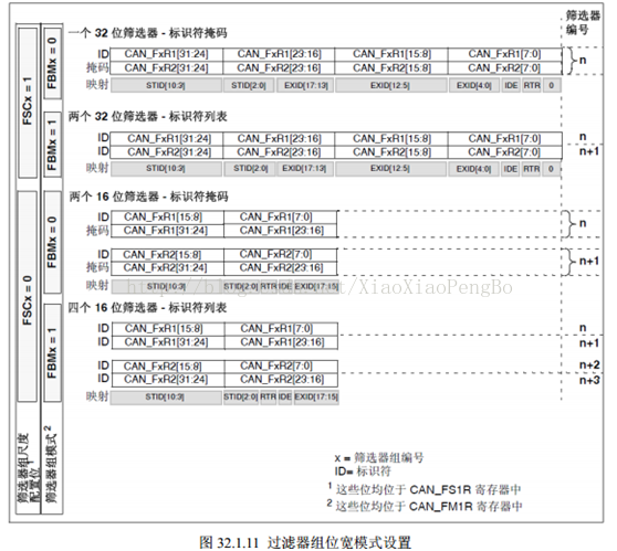 过滤器组中的每个过滤器,都被编号为(叫做过滤器号,图32.1.11中的n)从0开始,到某个最大数值-取决于过滤器组的模式和位宽的设置。