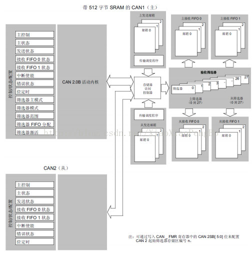 从图中可以看出两个CAN都分别拥有自己的发送邮箱和接收FIFO,但是他们共用28个