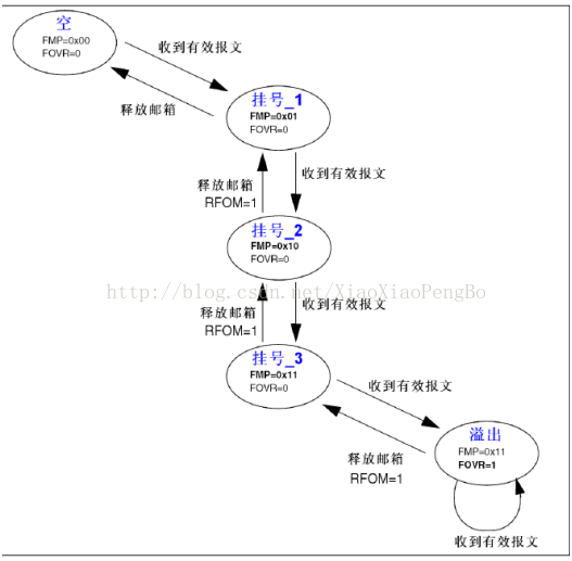 CAN接收流程为:FIFO空收到有效报文挂号_1(存入FIFO的一个邮箱,这个由硬件控制,我们不需要理会)收到有效报文挂号_2收到有效报文挂号_3收到有效报文溢出。