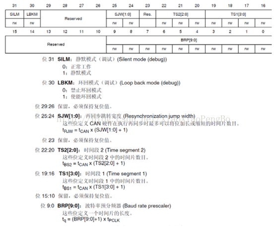 图中还给出了CAN波特率的计算公式,我们只需要知道BS1和BS2的设置,以及APB1