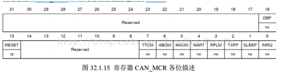 的时钟频率(一般为42Mhz),就可以方便的计算出波特率。比如设置TS1=6、TS2=5和BRP=5,在APB1频率为42Mhz的条件下,即可得到CAN通信的波特率=42000/[(7+6+1)*6]=500Kbps。接下来,我们介绍一下本章需要用到的一些比较重要的寄存器。首先,来看CAN的主控制寄存器(CAN_MCR),该寄存器各位描述如图