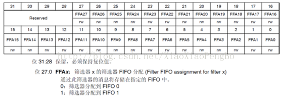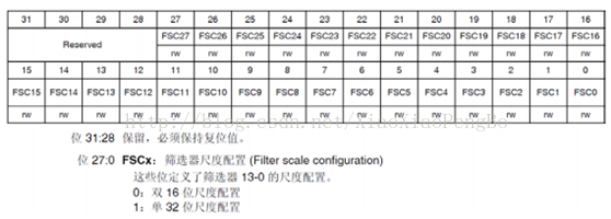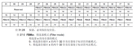 通过CAN_FMR寄存器,可以配置过滤器组的位宽和工作模式,如图所示