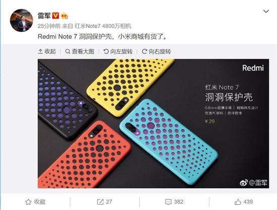 小米科技创始人兼CEO雷军微博表示,红米Note 7洞洞保护壳在小米商城有货了,售价29元。