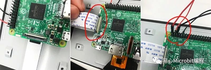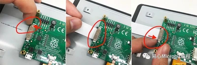 第一步首先将显示器与树莓派连接,使用这个主要用于连接液晶屏幕的 DSI(Display Serial Interface)接口,把电缆插入显示器侧的 DSI 电子连接器,再将供电用的跳线,接于树莓派 GPIO 端口。