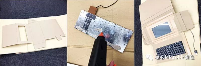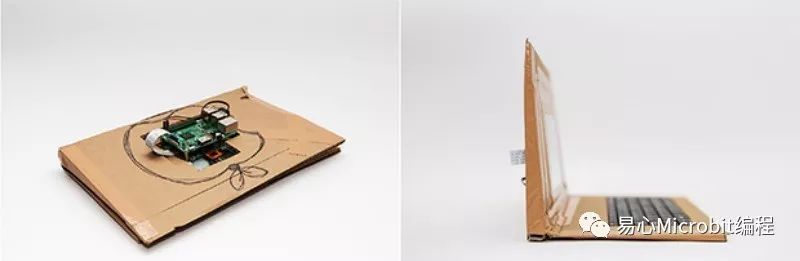 最后将裁切好的瓦楞纸板与屏幕和键盘固定在一起,世上独一无二的 PiBook 便大功告成。