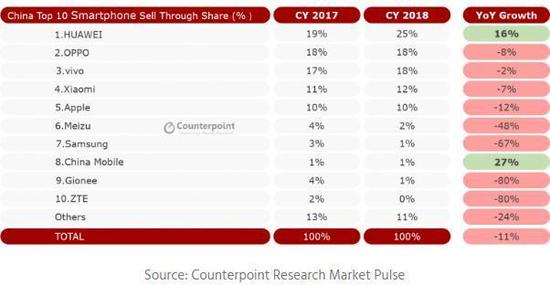 来自第三方市场调研机构Counterpoint发布的2018全年中国智能手机市场报告显示,2018年那个受老美制裁的手机厂商中兴由于芯片等关键手机元器件断供的影响,导致手机生产受到重挫,它的市场份额直接从2017年的2%降为了0%,同比大跌80%,真是让人震惊,哪怕遭遇破产的金立也比它强,虽然它的市场份额跌了三个中国移动,但仍有1%的市场份额。