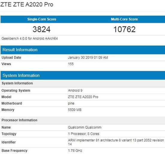 集微网消息,近日,中兴旗下一款型号为ZTE Axon A2020 Pro的手机现身跑分网站Geekbench,它预装Android9.0的操作系统,辅以6GB内存,搭载高通骁龙8核心处理器,从单核跑分3824分,多核跑分10762分的成绩看,ZTE Axon A2020 Pro搭载的处理器妥妥的是骁龙855。