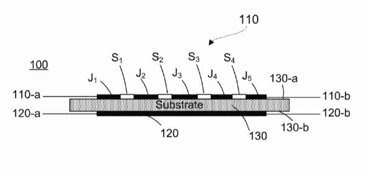 专利描述了一种形变传感装置,其包括弹性基板,导电元件和附加导电元件。导电元件包括由分解元件隔开的导电接头。导电接头和分解元件的不同组合对应于形变传感装置的不同区段。根据当应变施加到形变传感设备时导电接头和附加导电元件之间的电容变化,形变传感设备产生确定应变如何令形变传感设备变形的信号。