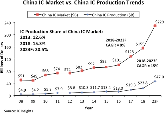 如下图所示,2018年中国集成电路产量仅占全球1550亿美元市场的15.3%,高于2013年前的12.6%。IC Insights预测到2023年这一比例将提升至20.5%。