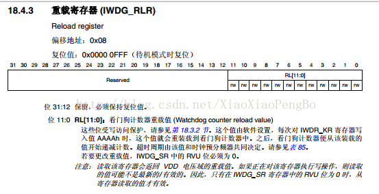在介绍完IWDG_PR之后,我们介绍一下重装载寄存器IWDG_RLR。该寄存器用来保存重