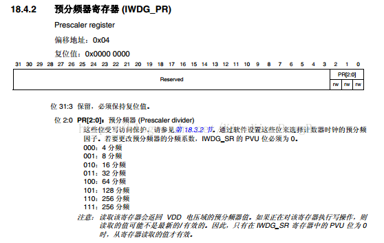 加载到计数器中从而避免产生看门狗复位 。IWDG_PR 和IWDG_RLR 寄存器具有写保护功能。要修改这两个寄存器的值,必须先向IWDG_KR寄存器中写入0x5555。将其他值写入这个寄存器将会打乱操作顺序,寄存器将重新被保护。重装载操作(即写入0xAAAA)也会启动写保护功能。 接下来,我们介绍预分频寄存器(IWDG_PR),该寄存器用来设置看门狗时钟的分频系数,最低为4,最高位256,该寄存器是一个32位的寄存器,但是我们只用了最低3位,其他都是保留位,预分频寄存器如下: