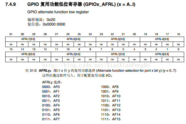 上图是针对引脚0-7,对 于引脚8-15,控制寄存器为GPIOx_AFRH。从图中可以看出。当需要使用复用功能的时候,我们配置相应的寄存器GPIOx_AFRL或者GPIOx_AFRH,让对应引脚通过复用器连接到对应的复用功能外设。这里我们列出GPIOx_AFRL寄存器的描述,