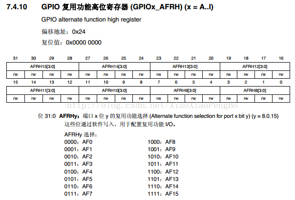 GPIOx_AFRH的作用跟GPIOx_AFRL类似,只不过GPIOx_AFRH控制的是一组IO口的高八位,GPIOx_AFRL控制的是一组IO口的低八位