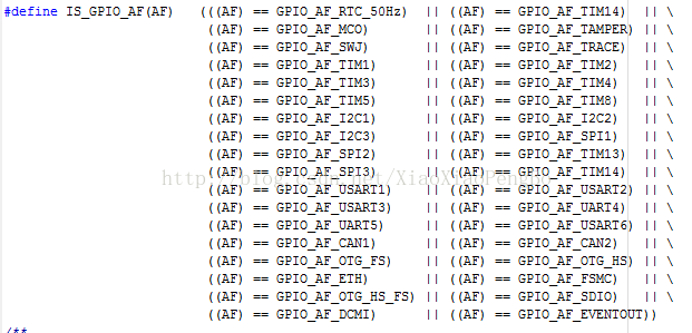 对于第三个参数,实际上我们确定了这个IO到底是复用为哪种功能之后,这个参数也很好选择,因为可选的参数在stm32f4xx_gpio.h列出来非常详细,如下