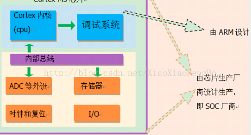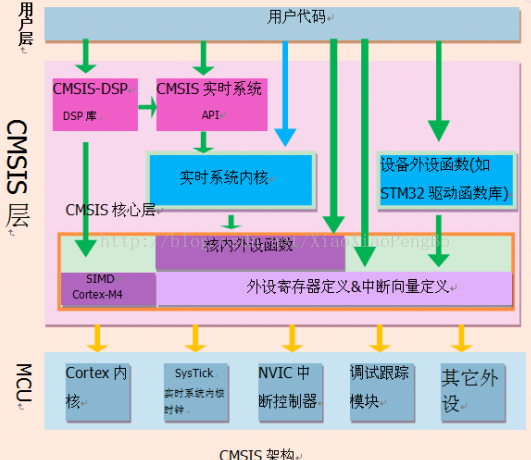 因为基于 Cortex的某系列芯片采用的内核都是相同的,区别主要为核外的片上外设的差异,这些差异却导致软件在同内核,不同外设的芯片上移植困难。为了解决不同的芯片厂商生产的 Cortex微控制器软件 的兼容性问题,ARM与芯片厂商建立了 CMSIS标准(Cortex MicroController Software InterfaceStandard)。所谓 CMSIS标准,实际是新建了一个软件抽象层