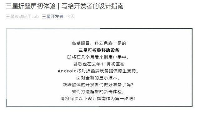 5. 三星放出折叠屏手机相关文档:今天三星在微信号“三星开发者”中放出了关于旗下可折叠屏幕手机的文档,以指导开发者为折叠屏手机开发体验更好的App。以此也正式官方确认了其折叠屏手机的存在且离发布应该不远了。