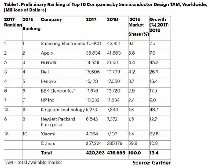 4. 华为成全球第三大芯片买家:市场研究公司Gartner发布的最新数据显示,2018年华为半导体采购支出超过210亿美元,成为全球第三大芯片买家,占据全球4.4%的市场份额。