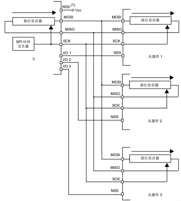 下图是主器件与多个从器件通信图。其中SCK,MOSI,MISO是接在一起的,NSS分别接到不同的IO管脚控制。主器件要和从器件通信就先拉低对应从器件的NSS管脚使能。默认状态IO1,IO2,IO3全为高电平,当主器件和从器件1通信时,拉低IO1管脚使能从器件1。而从器件2,3不使能,不作响应。