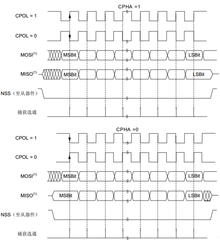 根据时钟极性(CPOL)及相位(CPHA)不同,SPI有四种工作模式。