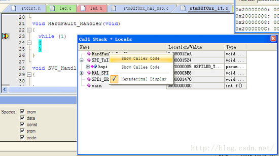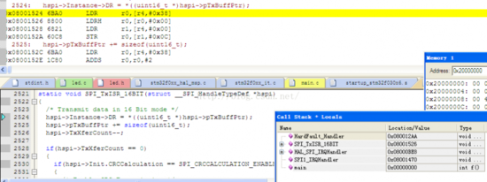 选择Show Caller,会出现下图,即hspi->Instance->DR = *((uint16_t *)hspi->pTxBuffPtr)这句引起了Hardfault。
