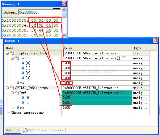 知道是哪里引起的就好办了,经过分析,发现*((uint16_t *)hspi->pTxBuffPtr)这里面的hspi->pTxBuffPtr就是指向0x20000005,引发了hardfault。让我们来看一下内存分布: