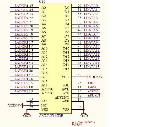 S3C2440 的ADDR1 要接AM29LV160DB 的A0。上图中AM29LV160DB 的A20,A21 是空脚,分别接的是LADDR21,LADDR22。这应该是为了以后方便扩展NOR FLASH 的容量。LADDR21,LADDR22 对AM29LV160DB 是没用的。