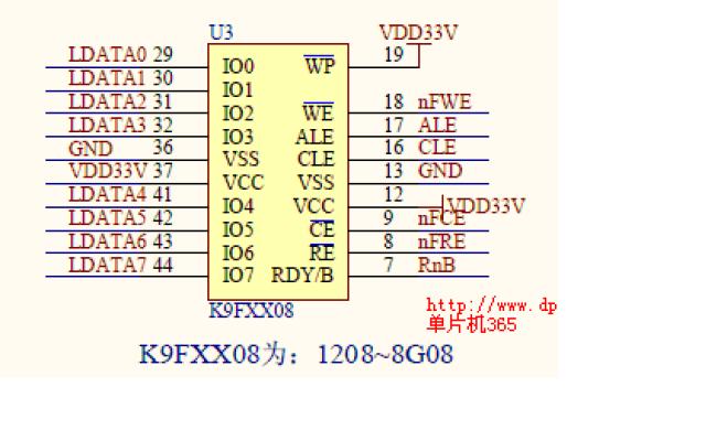 对K9F1208 来说,地址和命令只能在I/O[7:0]上传递,数据宽度是8 位。