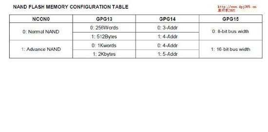 当选定一个NAND FLASH 的型号后,要根据选定的NAND FLASH 来确定S3C2440 的NCON,GPG13,GPG14,GPG15 的状态。