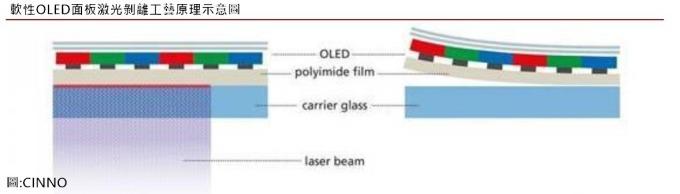 至于如何将 OLED 硬式面板转变成柔性面板,主要的工艺差别简单来说在于柔性面板利用激光剥离设备,将玻璃与基材分离。