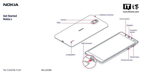 此次通过认证的诺基亚手机型号为TA-1123以及TA-1111(欧洲单卡)、TA-1130(欧洲双卡),FCC认证文件包含了这款手机的用户手册,并展示了该机的外观示意图。
