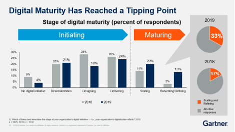 企业的数字化进程可以分为两大阶段,而第一大阶段可再分为四小阶段:“根本没有数字化”、“已经有了数字化的愿景”、“开始设计数字化解决方案”、“已经交付了数字化解决方案”——这些都归为数字化初始阶段。第二大阶段亦可再分为两小阶段:“数字化已经规模化”和“数字化已经开始收获并优化”——第二大阶段称之为成熟阶段。Gartner调研发现当前越来越多的企业开始走向成熟。