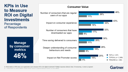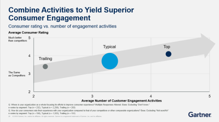 Gartner将调查的企业分为三大类:Trailing(差)、Typical(中)、Top(优)。以此来衡量采用数字化手段的程度。其中不难发现,越好的企业采用数字化手段的程度就越高,从而客户就越满意。