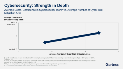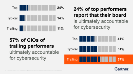 此外,随着物联网的普及,安全也会被越来越多的企业所重视。几乎所有的首席信息官都认为安全形势会越发糟糕。并且95%的首席信息官高度重视网络安全,表明有必要构建用以保护企业机构和客户的数字化业务安全基础。从中可以看出,越是优秀的企业(Top)对安全防御的重视度就越高,这些企业都是由董事会负责网络安全,而非由首席信息官独自承担。尽管如此,首席信息官正在采取各种措施,强化信息处理资产,并尽力影响使用技术之人,针对网络威胁而改善安全状况。并且他们采取的防范措施也会增多,所以他们对自己产品安全的自信程度也会千差万别。