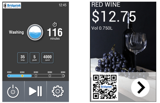 EVE第三代芯片BT81X系列具有自适应可伸缩纹理压缩(ASTC)功能,具有强大的独立立即彩现(render)功能。可以支持分辨率高达1280x720像素的显示器和高达11英吋对角线的面板,以及支持最多5个触控点的电容式触控屏。EVE能够为传统电子设备注入新的活力经由HMI的更新,众多应用都可以因这项技术而从中受益包括销售点(PoS)、家用电器、血压计、电表、机顶盒、科学仪器、电梯控制、安全系统、工业控制、GPS导航设备、心率监测器、自动售货机和家庭自动化系统。图1中显示EVE通过SPI接口与MCU连接,并提供下列示例:a先进洗衣机的HMI;b应用于酒商的智能货架。