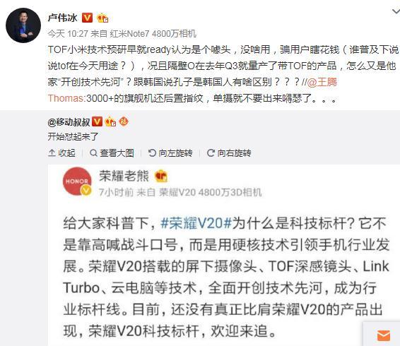 很快小米公司产品总监微博名为王腾Thomas的高管出来迎战了,他嘲讽荣耀V20虽然是售价3000元以上的旗舰机,但还是后置指纹与单摄像头,建议它别出来嘚瑟。